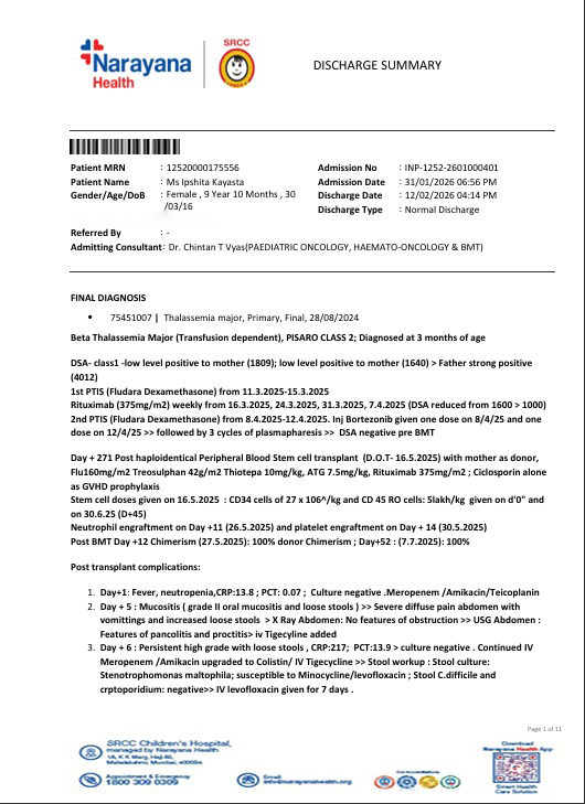 This is an urgent appeal for Ms. Ipshita Kayasta, who is currently undergoing Post Bone Marrow Transplant (Post BMT) Care under the supervision of Dr. Chintan Vyas at SRCC Children’s Hospital, Mumbai (Managed by Narayana Health). Post-transplant care is a critical phase that requires continuous medical monitoring, medications, and supportive treatment to ensure successful recovery and prevent complications. As per the hospital estimate, the total cost for Post BMT Care in the General Ward for a duration of 6 months is ₹20,00,000 (Twenty Lakh Rupees). The final amount may vary depending on the patient’s response to treatment and medical requirements during this period. Managing such a substantial medical expense is extremely challenging for the family. They urgently need support to continue the required post-transplant care without interruption. Your contribution can help ensure proper recovery and give Ipshita the best chance at a healthy future. Every donation makes a meaningful difference.